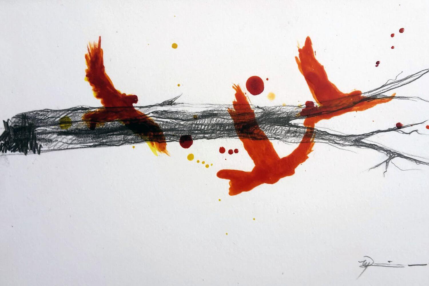 Aves de amor murmurando una canción, precursan melódicamente, jaulas en perfiles de los sexos. Estas figuras nos piden cuestionar nuestras ideas sobre el amor, el apego, la procreación y la conexión. ¿Hasta qué punto es fundamental a nuestra sobrevivencia el poeta interno? ¿Cuantas canciones o sonetos de amor sirven para hacer el mismo “amor” entendible, o lo suficientemente poético, para contener con seguridad nuestra inherente soledad?.